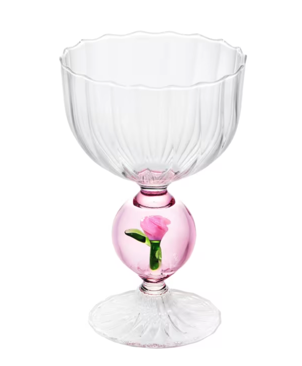 유리 속에 피어난 장미가 시선을 사로잡는 우아한 와인잔.